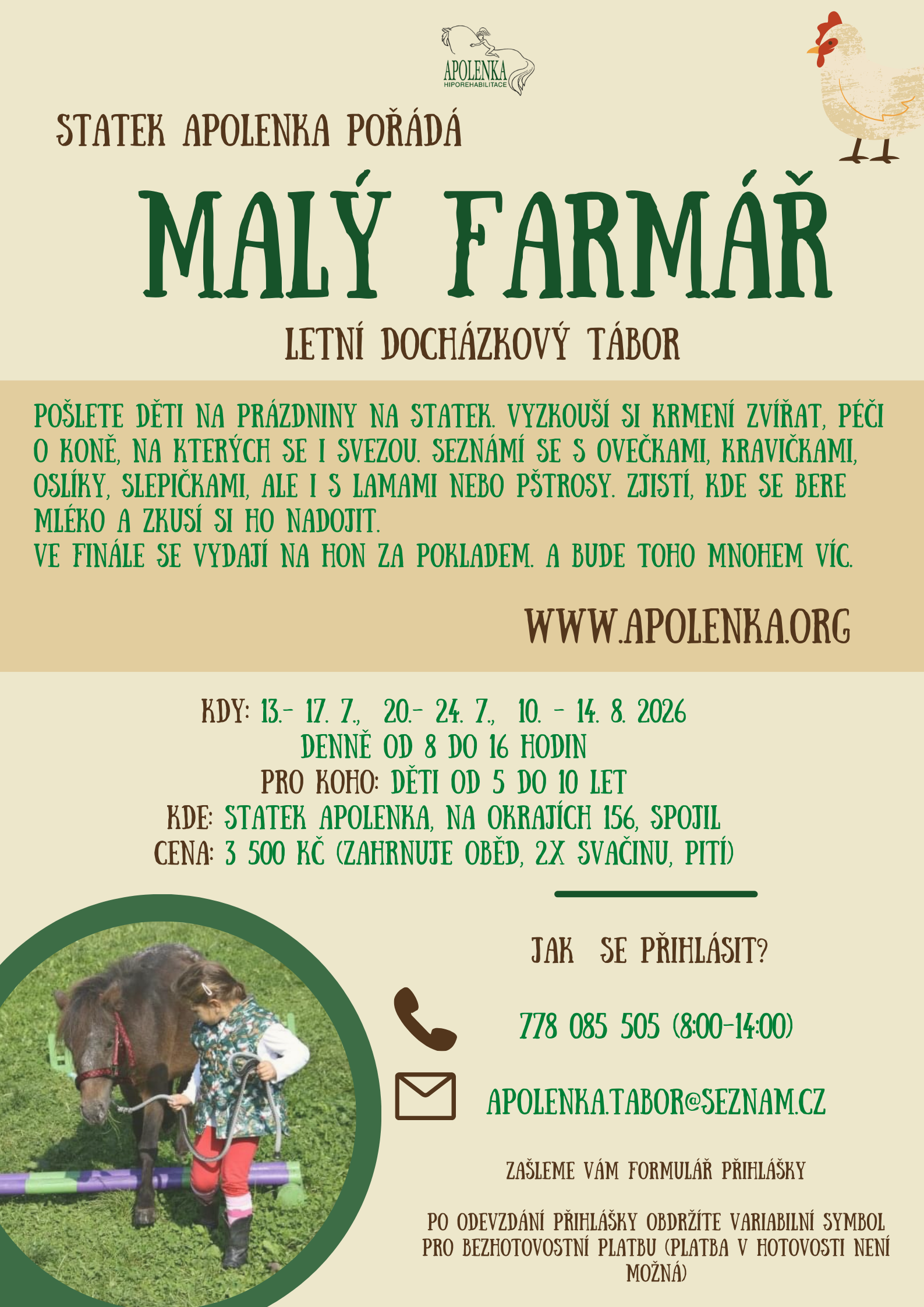 Na telefonu 778 085 505 (8:00–14:00) nebo e-mailu apolenka.tabor@seznam.cz. Po přihlášení vám zašleme formulář přihlášky a variabilní symbol pro bezhotovostní platbu (platba v hotovosti není možná).
